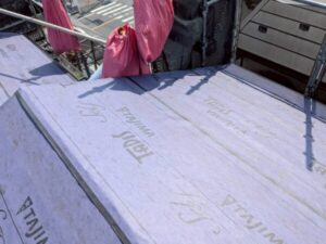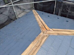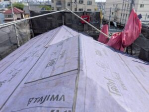 既存の劣化している屋根材はついたままですので、ルーフィングを張ることで下地材を補強し、屋根の耐久性を強化いたします。