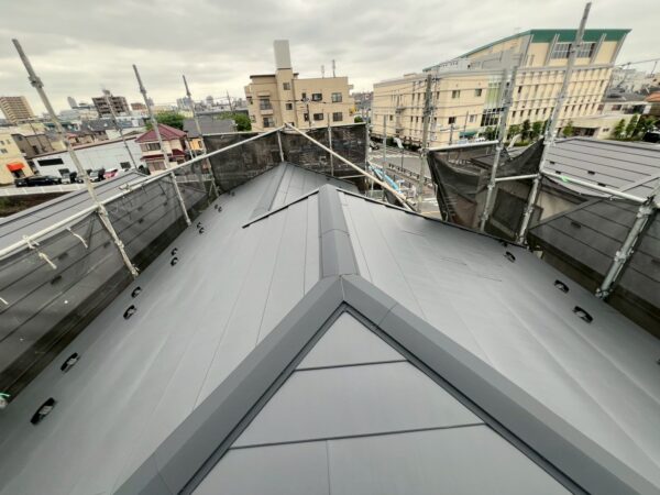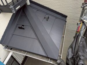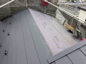 ルーフィングで下地材を補強した後に、新たな屋根材を葺いてまいります。今回は「横暖ルーフ」という屋根材を使用いたします。こちらの屋根材は金属製の屋根になりますので、軽量でございます。また、塗装工事のような定期的なメンテナンスもそれほど行う必要がなく、施工後長く安心してお過ごしいただくことが出来ます。